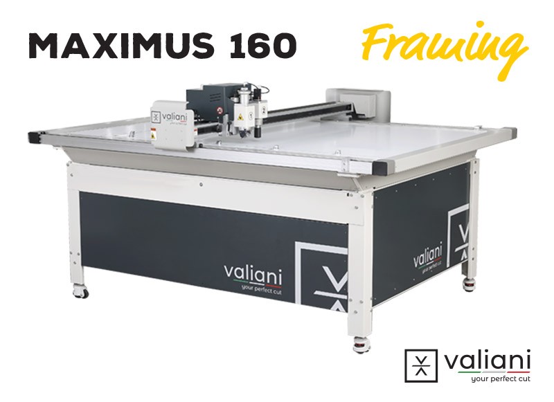 Valiani Maximus 160 je natančen, učinkovit, prilagodljiv in robusten elektronski rezalni stroj z dvojno glavo namenjen okviraški industriji. 2 neodvisna sistema glav preprečujeta prekinitev med delovnim ciklom. Odlikuje ga visoka hitrost in natančnost. Namenjen je profesionalnim uporabnikom. Menjava glav je enostavna. Reže do debeline 20 mm. Globino reza se lahko nastavi ročno s koraki po 0,1 mm, tako zagotavlja boljši nadzor kakovosti ko delamo z različnimi materiali in debelinami.